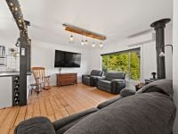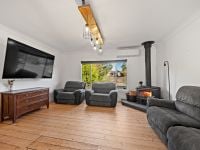 - Warm and inviting living area with Nectre wood heater on raised stone hearth