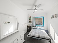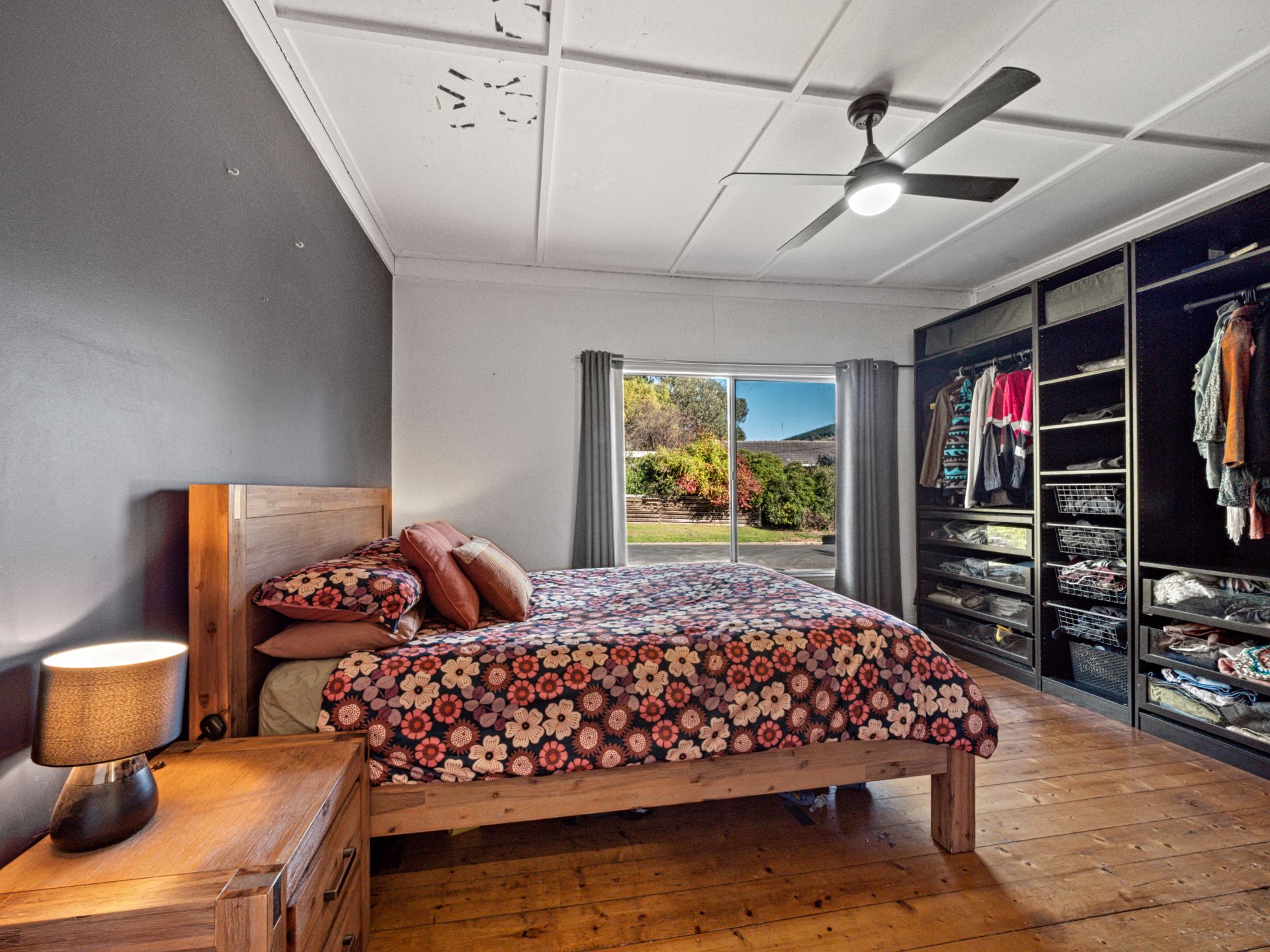 - Master bedroom with open wardrobes, ceiling fan & original timber floors