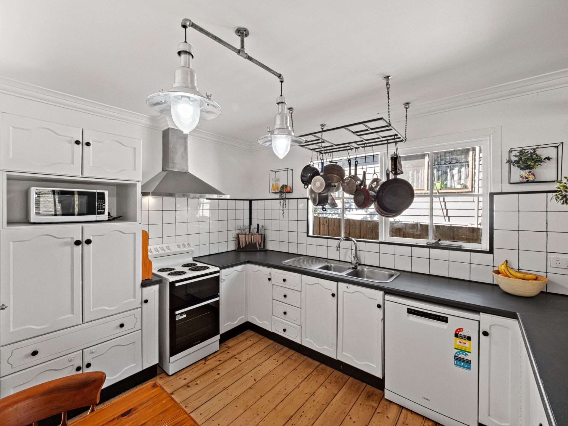 - Open-plan kitchen/dining with exposed steel beam, pot rack & timber charm