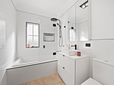 - Two additional bedrooms with heritage-style wall strapping and fans
