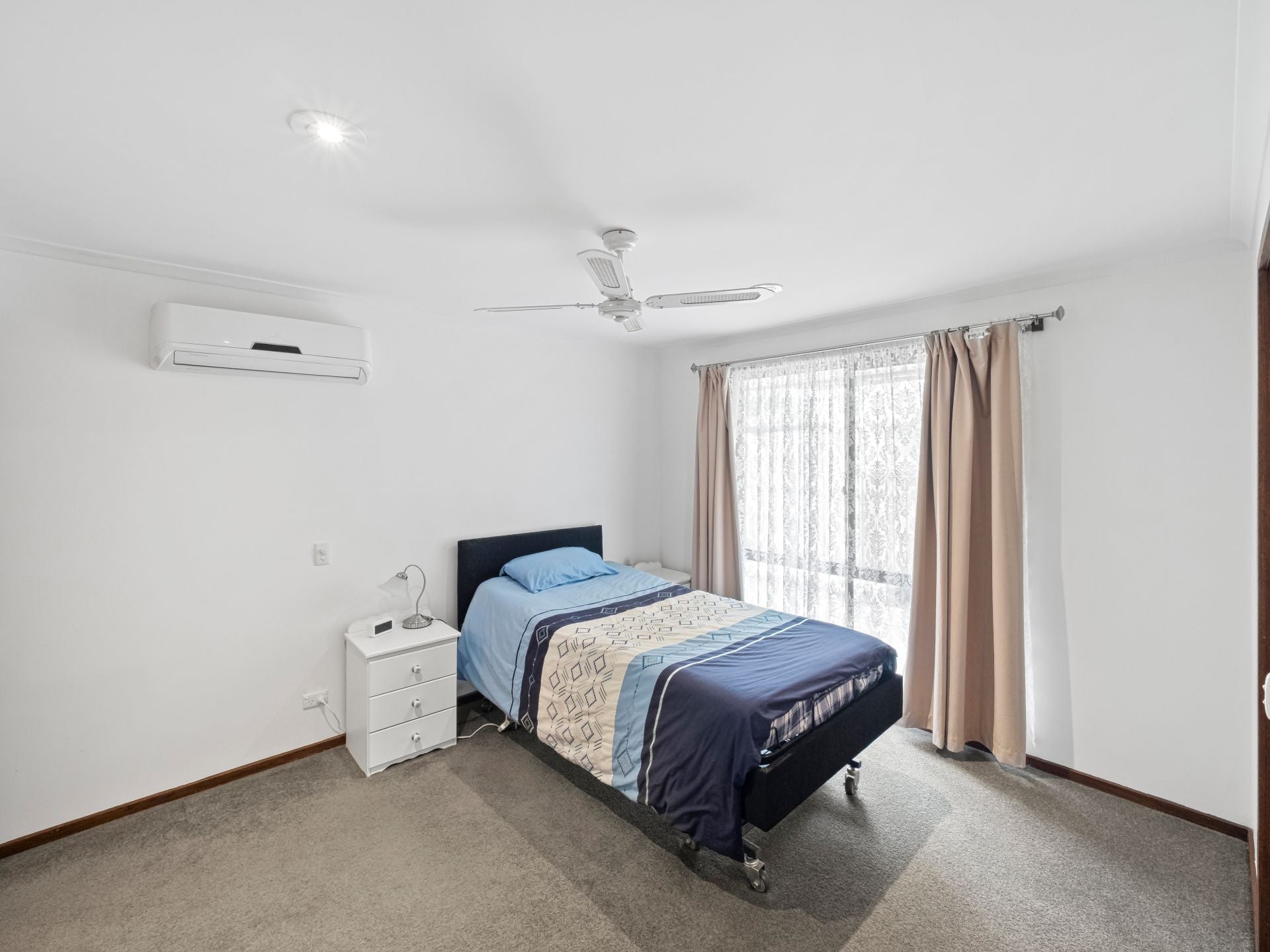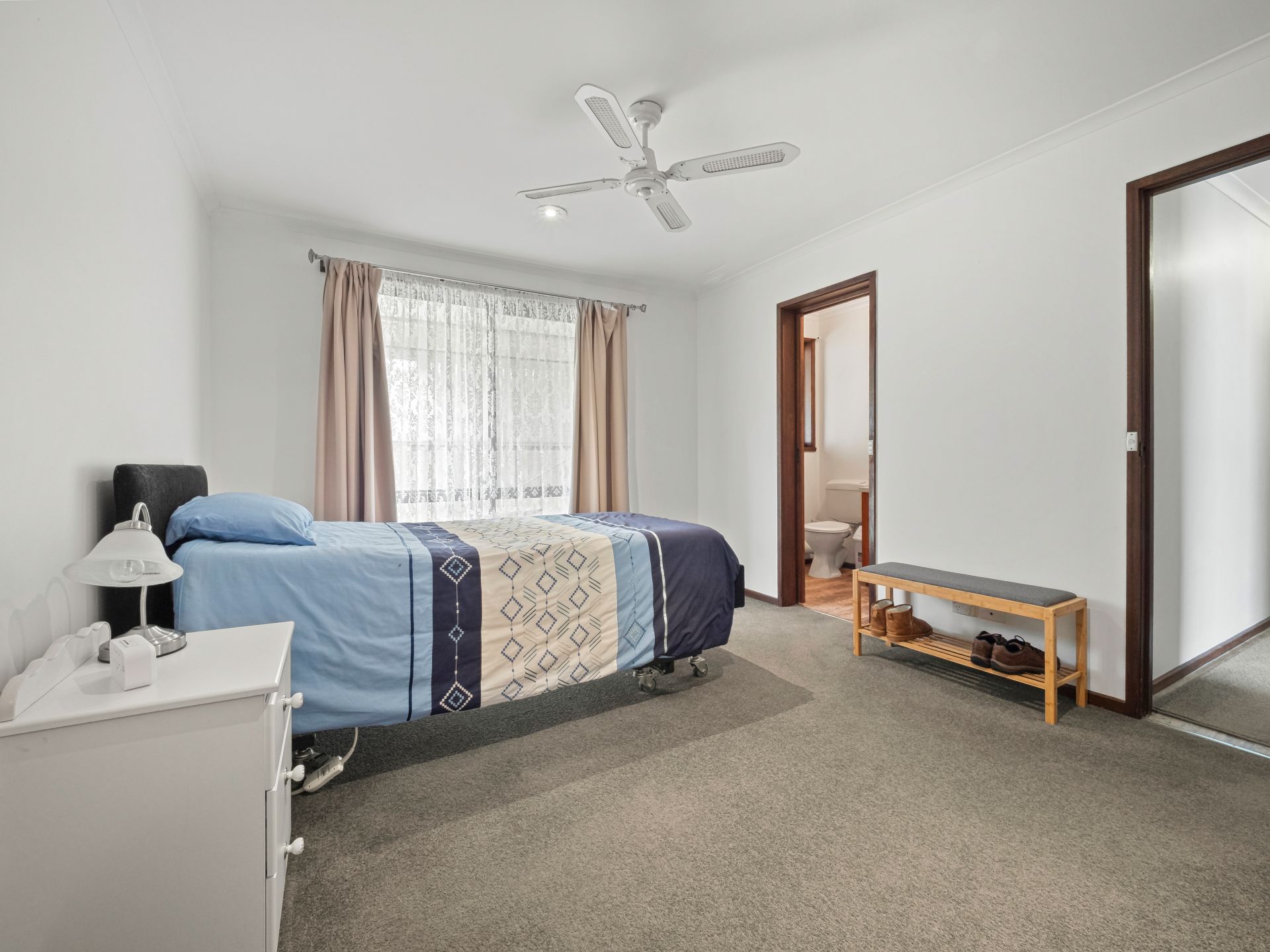 - Generously sized master bedroom includes a walk-in robe, ceiling fan, and split system while the ensuite is neatly appointed with a step in shower, vanity, and toilet.
