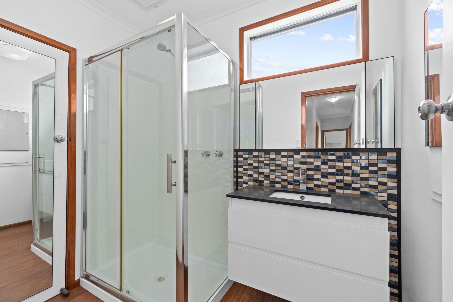 - Updated bathroom with step-in shower, generous storage, and a separate toilet