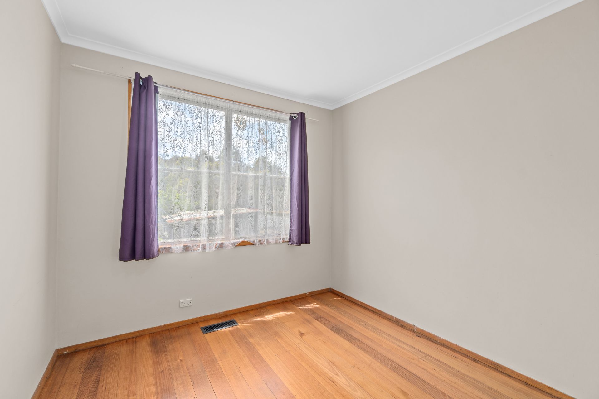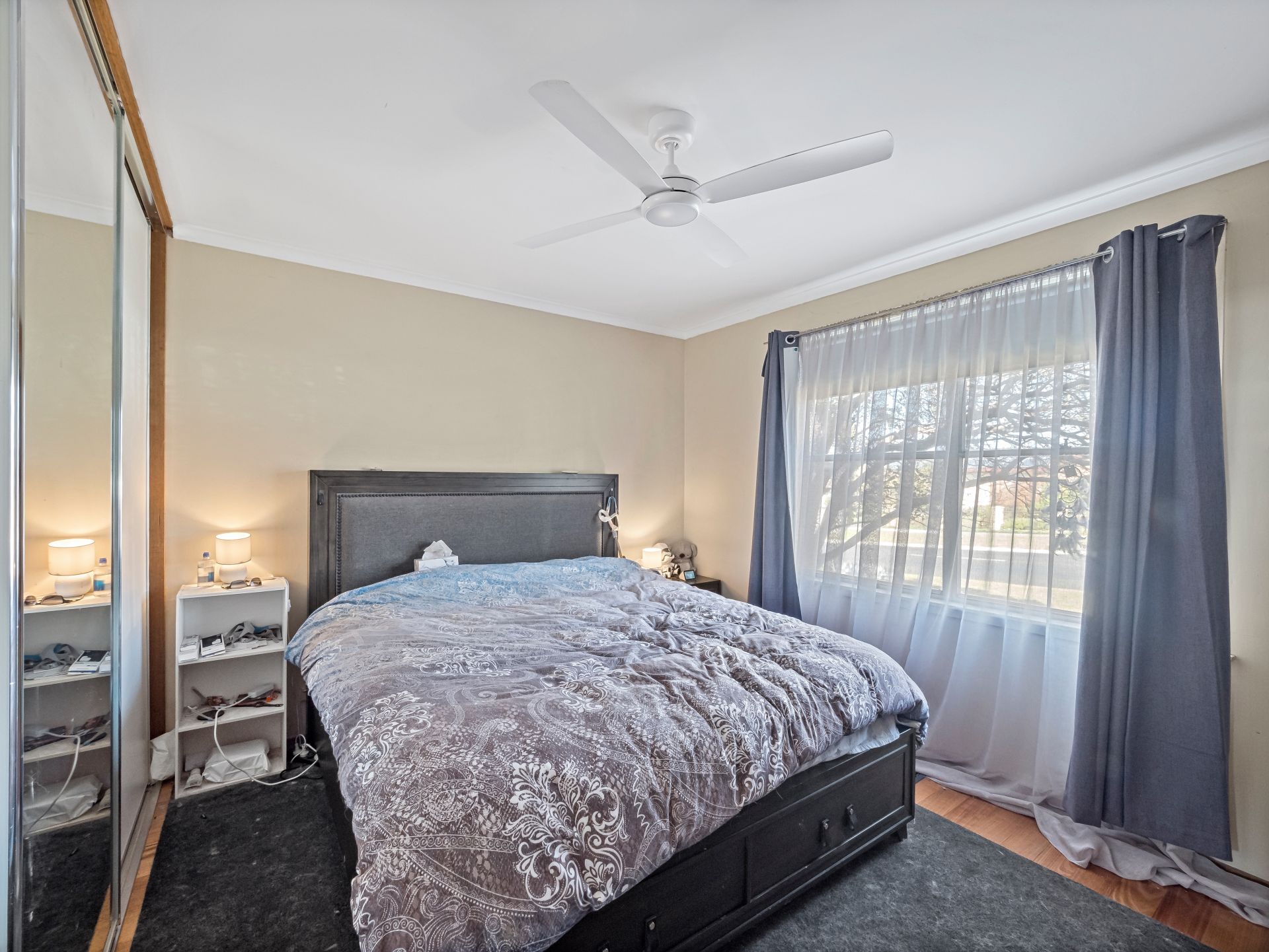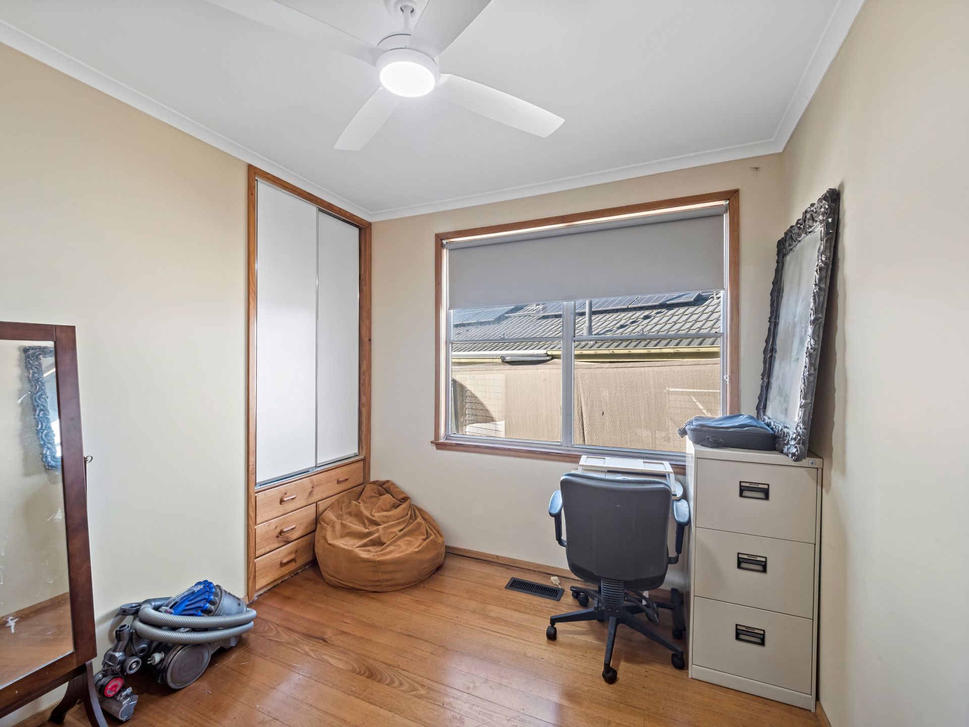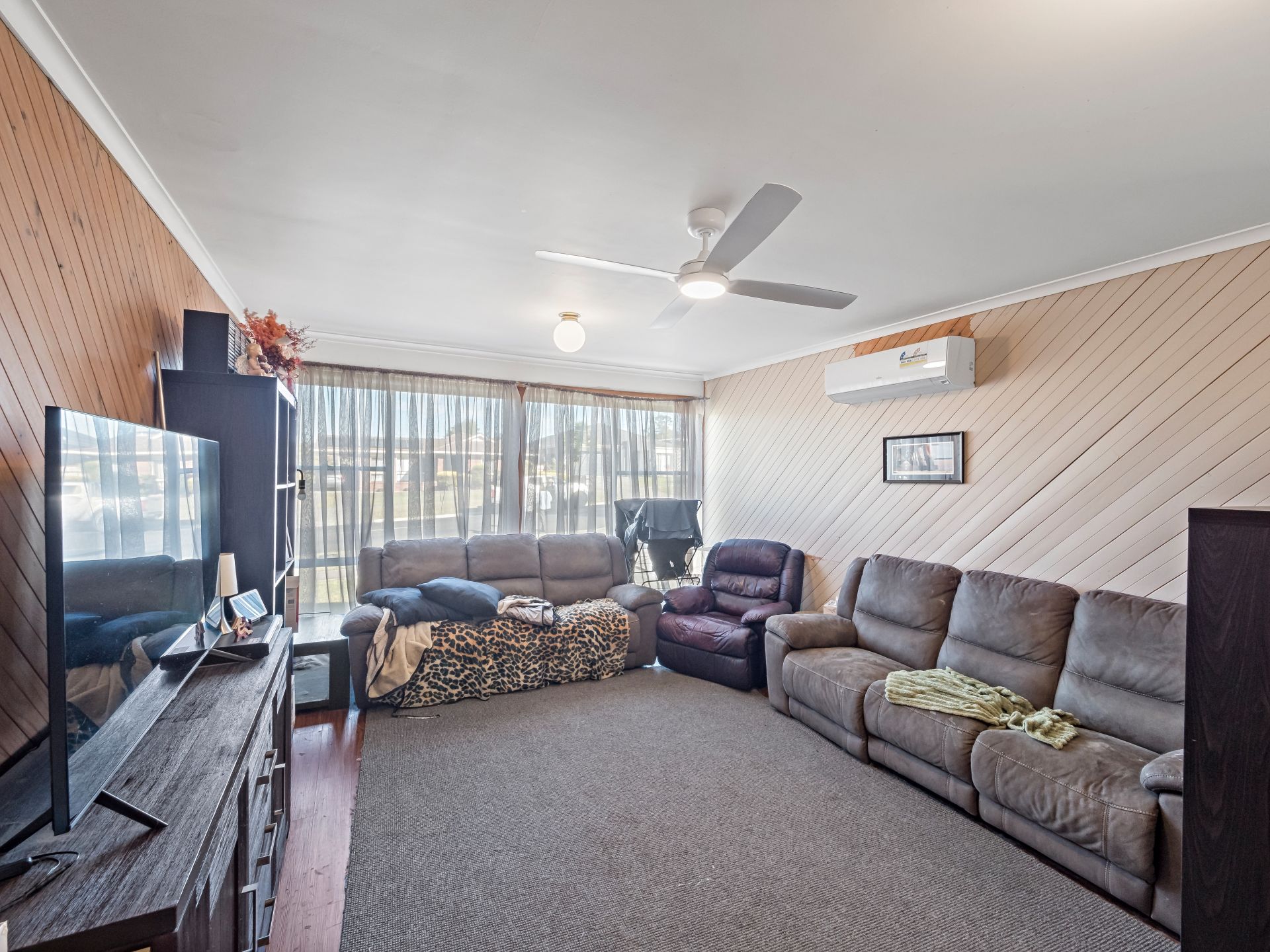 - Spacious living area with timber plank flooring, ceiling fan, and split system air conditioning