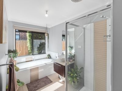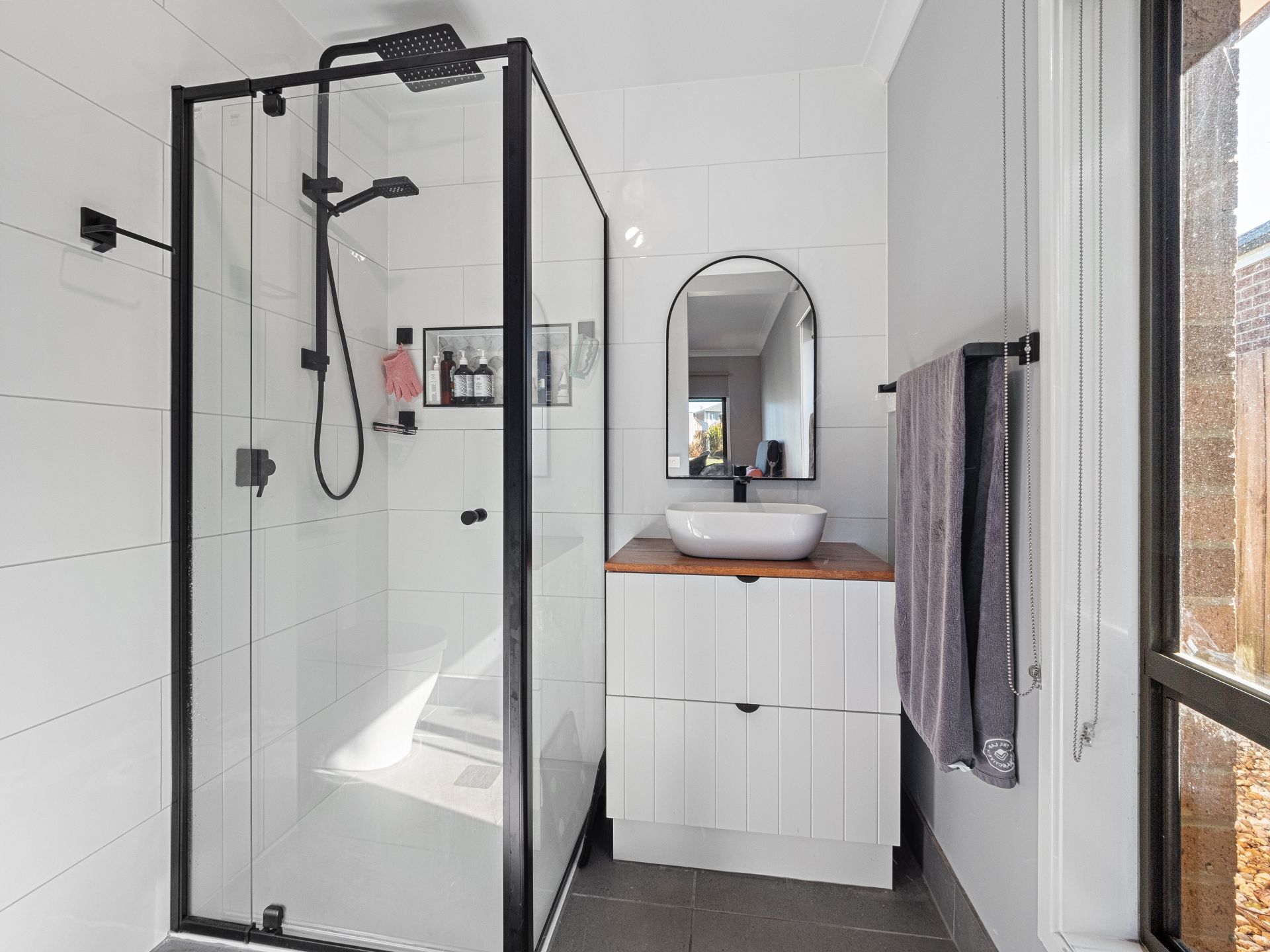 - The master suite offers a relaxing retreat, complete with walk in robe and stylish en-suite showcasing bold black fixtures.